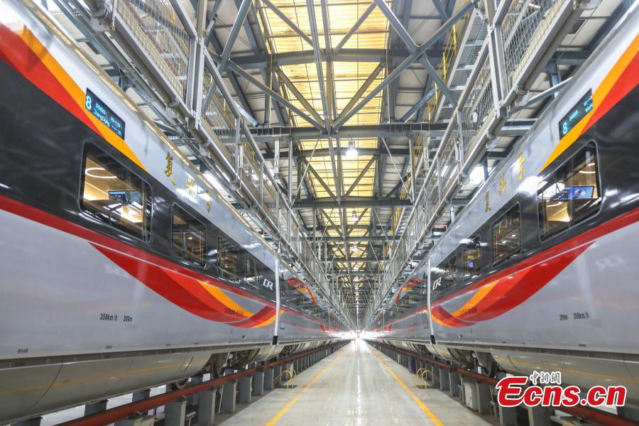 Fuxing bullet intelligent trains make debut at a maintenance station of Nanchang Railway in Nanchang, east China's Jiangxi Province, Oct. 8, 2022. The Fuxing bullet trains are expected to start operation soon. (Photo: China News Service/Liu Lixin)