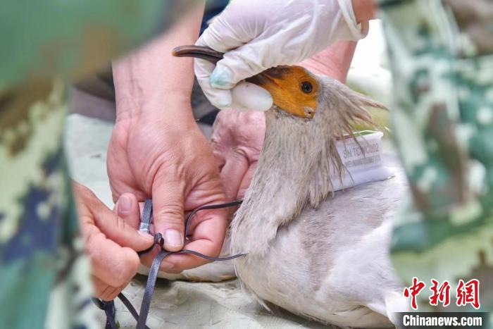 Guardians of crested ibises put a tracking device on a crested ibis born this year. (Photo/Shi Tonggang)