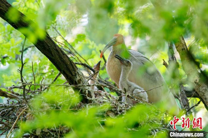 A crested ibis feeds its chicks in the nest atop a tree in Tongchuan city, northwest China's Shaanxi Province. (Photo/Shi Tonggang)