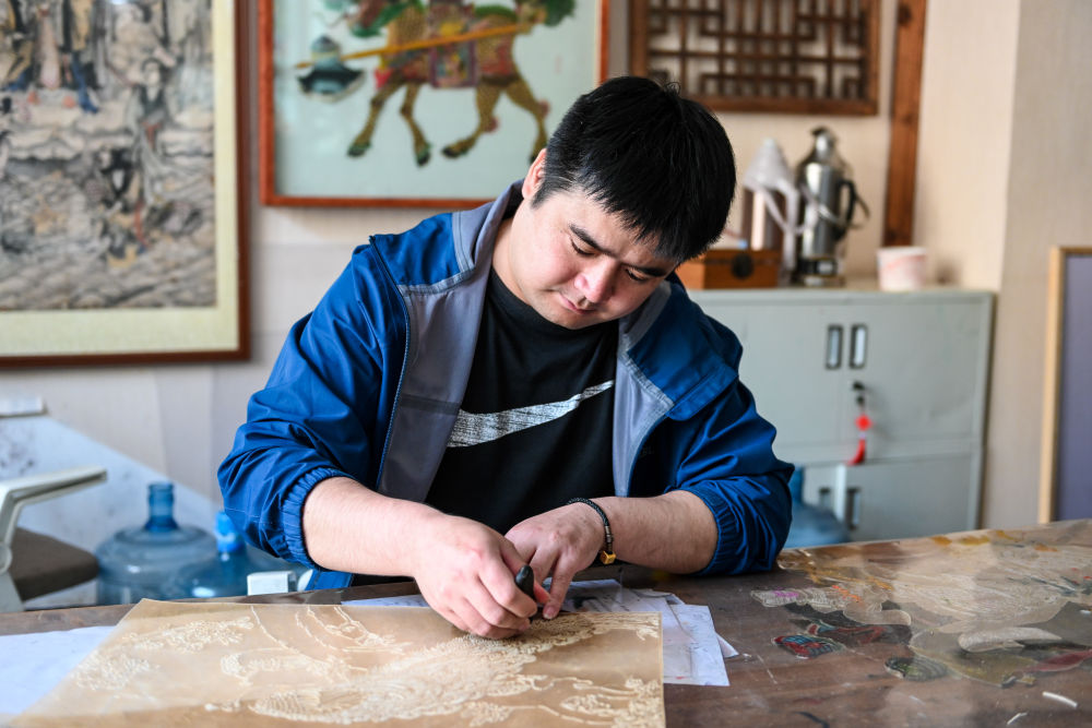Liu Chaokan, a 30-year-old inheritor of Chinese shadow puppetry, makes shadow puppets. (Photo/Xinhua)