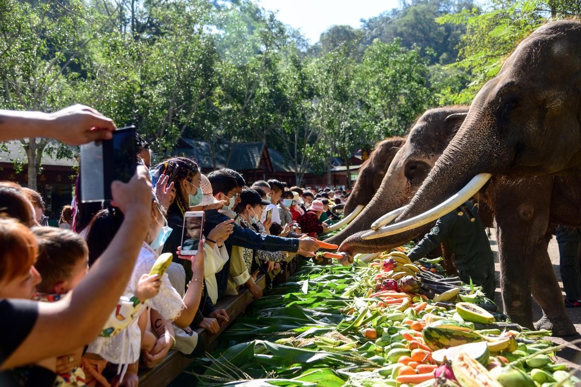 People feed elephants in Xishuangbanna Dai autonomous region, southwest China's Yunnan province, Feb. 22, 2021. (People's Daily Online/Li Ming)