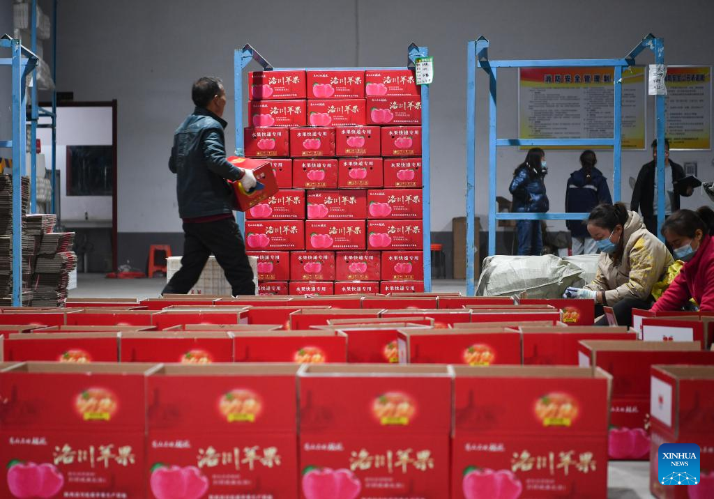 Staff members pack apples in Luochuan County, northwest China's Shaanxi Province, Oct. 10, 2022. (Xinhua/Zhang Bowen)