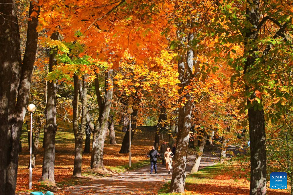 People walk in a park in Minsk, Belarus, Oct. 10, 2022. (Photo by Henadz Zhinkov/Xinhua)