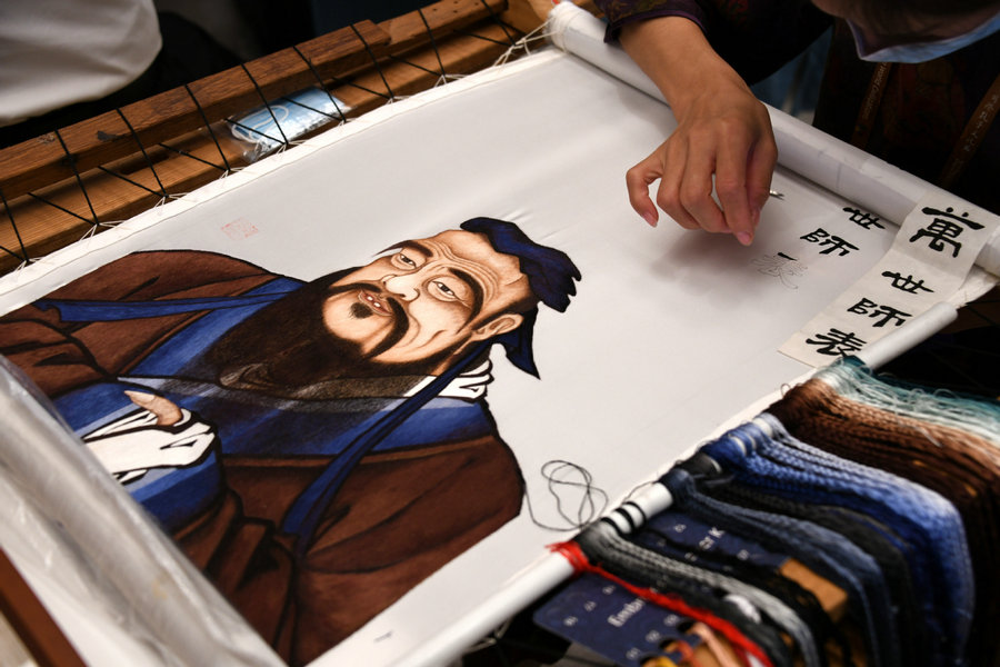Li Yinfeng, an intangible cultural heritage inheritor of embroidery, creates an embroidery artwork of a portrait of Confucius on Sept 26, 2022. [Photo/Xinhua]