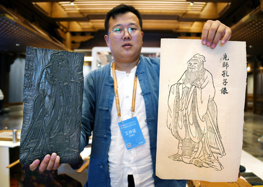Pan Chenglong, an intangible cultural heritage inheritor of the woodblock printing of New Year painting, showcases his woodblock printing work of the portrait of Confucius on Sept 26, 2022. [Photo/Xinhua]