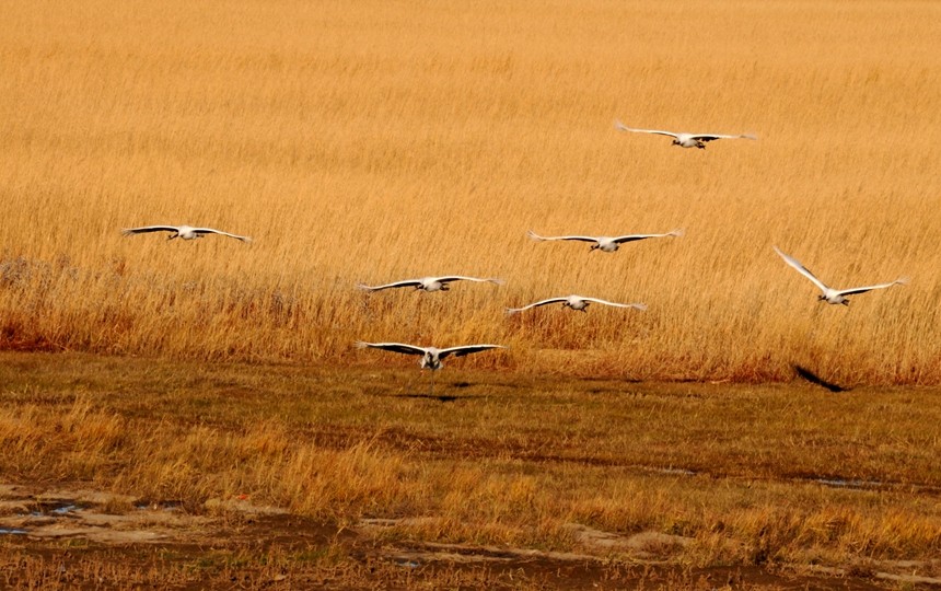 Red-crowned cranes fly at Zhalong National Nature Reserve in northeast China's Heilongjiang Province.