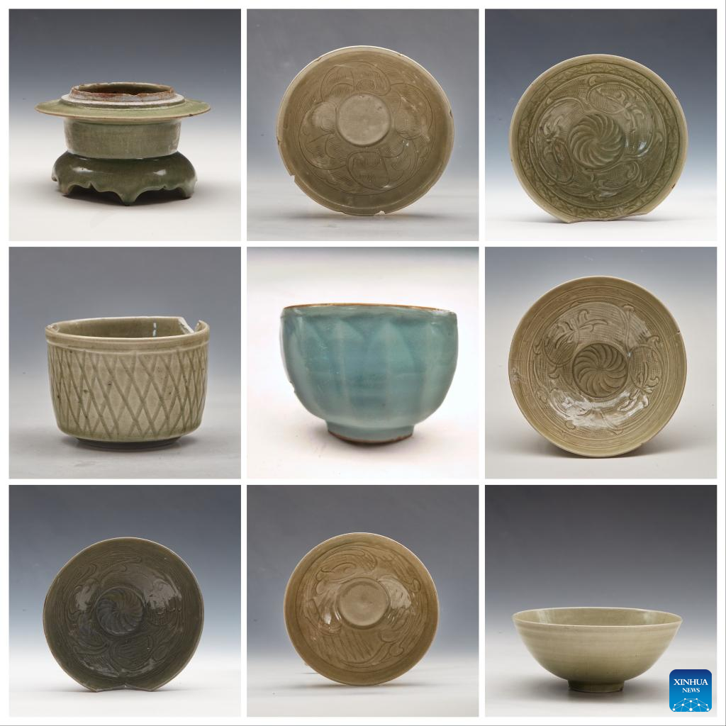 Undated combo photo shows porcelain wares discovered at the archaeological site of Shuomen ancient port in Wenzhou, east China's Zhejiang Province.