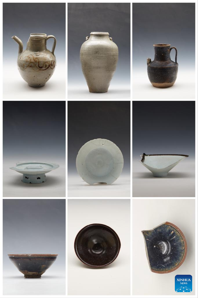 Undated combo photo shows porcelain wares discovered at the archaeological site of Shuomen ancient port in Wenzhou, east China's Zhejiang Province.