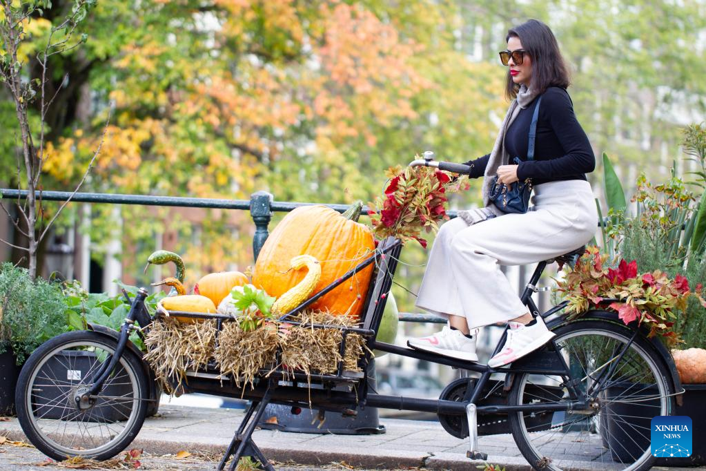 A woman is seen on a bicycle decorated with pumpkins in central Amsterdam, the Netherlands, on Oct. 11, 2022. (Photo by Sylvia Lederer/Xinhua)