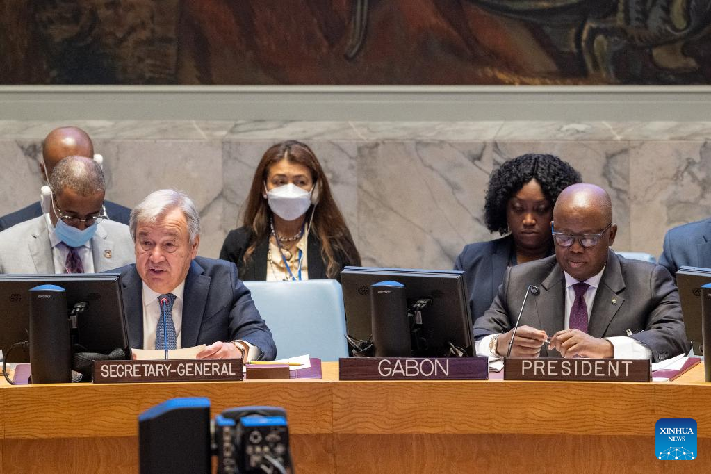 UN Secretary-General Antonio Guterres (L, Front) addresses a Security Council meeting on cooperation between the United Nations and regional and subregional organizations in maintaining international peace and security at the UN headquarters in New York, on Oct. 11, 2022. Lauding the collaboration between the United Nations and the African Union (AU) as the best ever, UN Secretary-General Antonio Guterres on Tuesday warned major challenges lie ahead. (Eskinder Debebe/UN Photo/Handout via Xinhua)