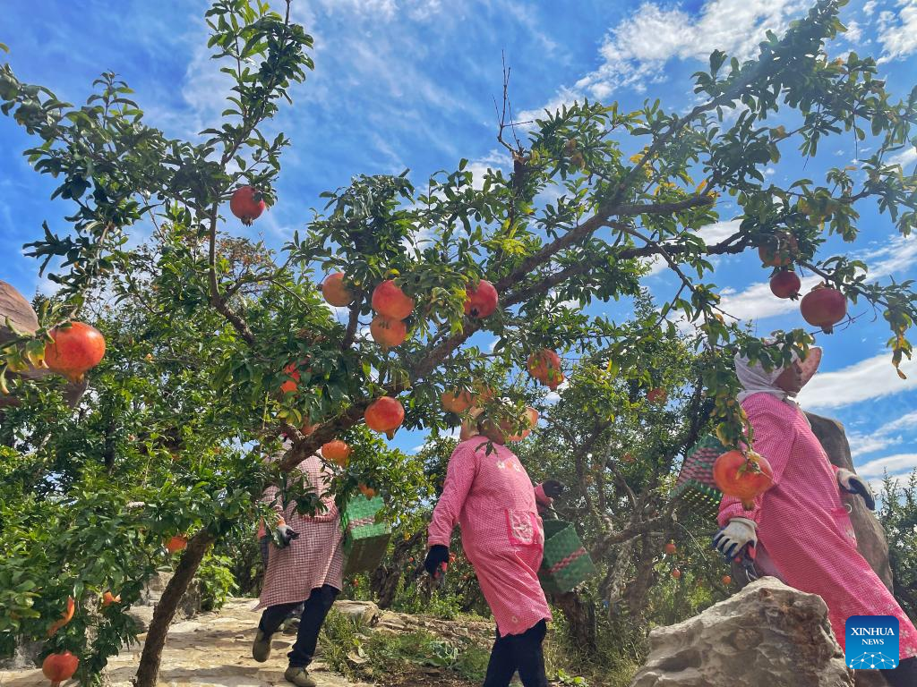 Villagers harvest pomegranates in an orchard in Liuyuan Town of Yicheng District in Zaozhuang City, east China's Shandong Province, Oct. 9, 2022. Villagers are busy harvesting and trading pomegranates recently in Liuyuan, a town famous for producing pomegranates. (Xinhua/Fan Changguo)