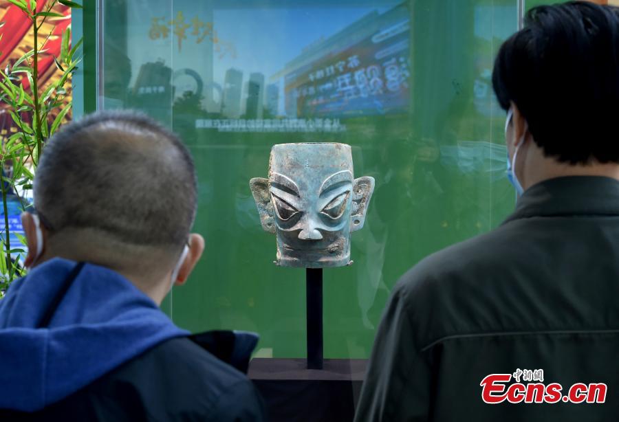 A bronze human head unearthed from the No. 8 sacrificial pit of Sanxingdui Ruins sit is on display during the themed exhibition "Forging Ahead in the New Era" in Beijing, Oct. 10, 2022. (Photo: China News Network/Li Peiyun)