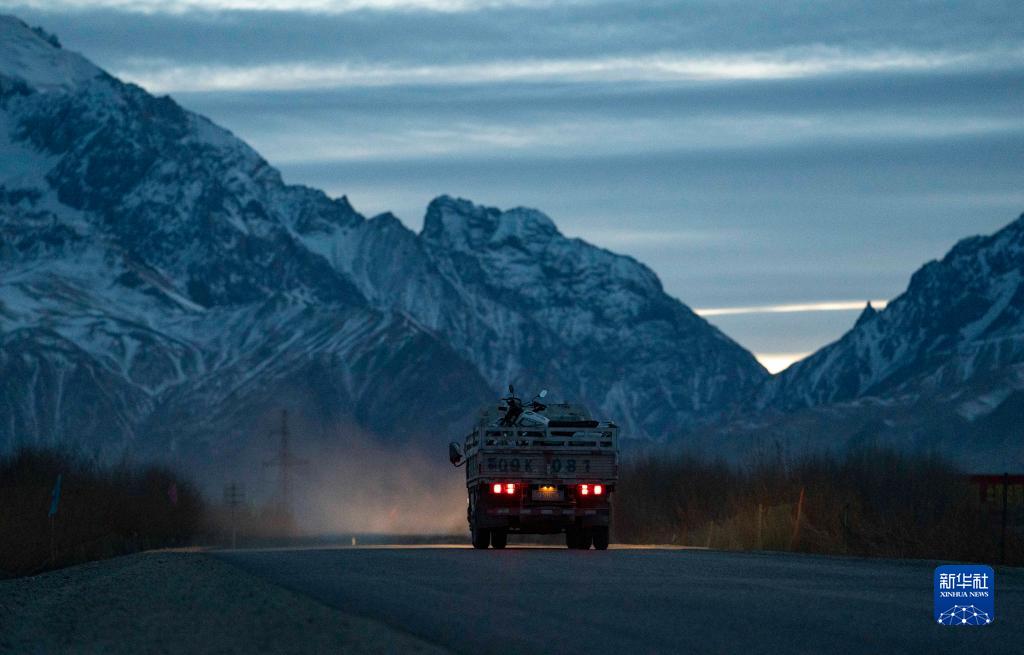 Photo taken on Nov. 17, 2018, shows a vehicle running on a mountain road at night in Taxkorgan Tajik Autonomous County, northwest China's Xinjiang Uygur Autonomous Region. (Xinhua/Hu Huhu)