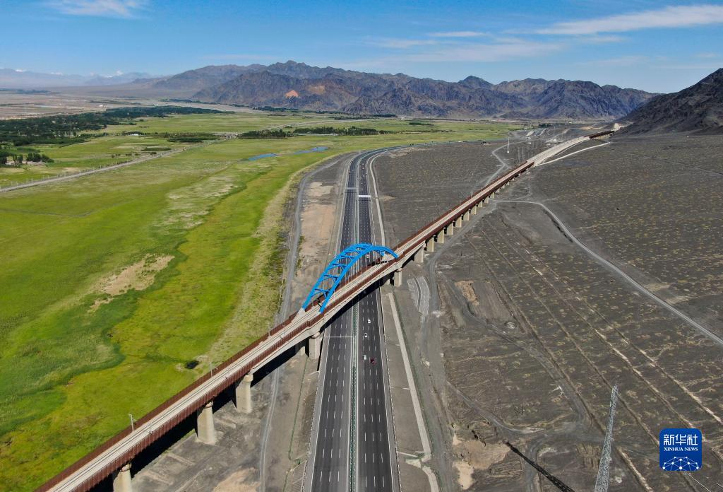Aerial photo taken on July 1, 2020, shows a section of the Lianyungang-Khorgos Expressway in northwest China's Xinjiang Uygur Autonomous Region. (Photo courtesy of the transport department of Xinjiang)