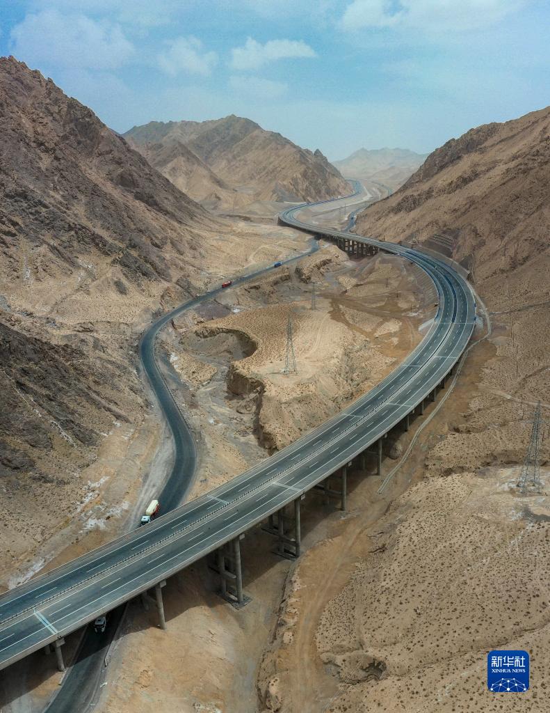 Aerial photo taken on May 9, 2022, shows a section of the expressway linking Yetimbulak township and Ruoqiang county in northwest China's Xinjiang Uygur Autonomous Region. (Photo courtesy of the media convergence center of Ruoqiang county)