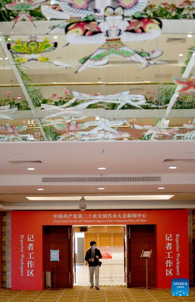 Photo taken on Oct. 12, 2022 shows the reporter workspace of the press center for the 20th National Congress of the Communist Party of China (CPC) in Beijing, capital of China. The press center for the upcoming 20th National Congress of the Communist Party of China (CPC) officially opened on Wednesday to provide services for journalists covering the congress. (Xinhua/Wang Yuguo)