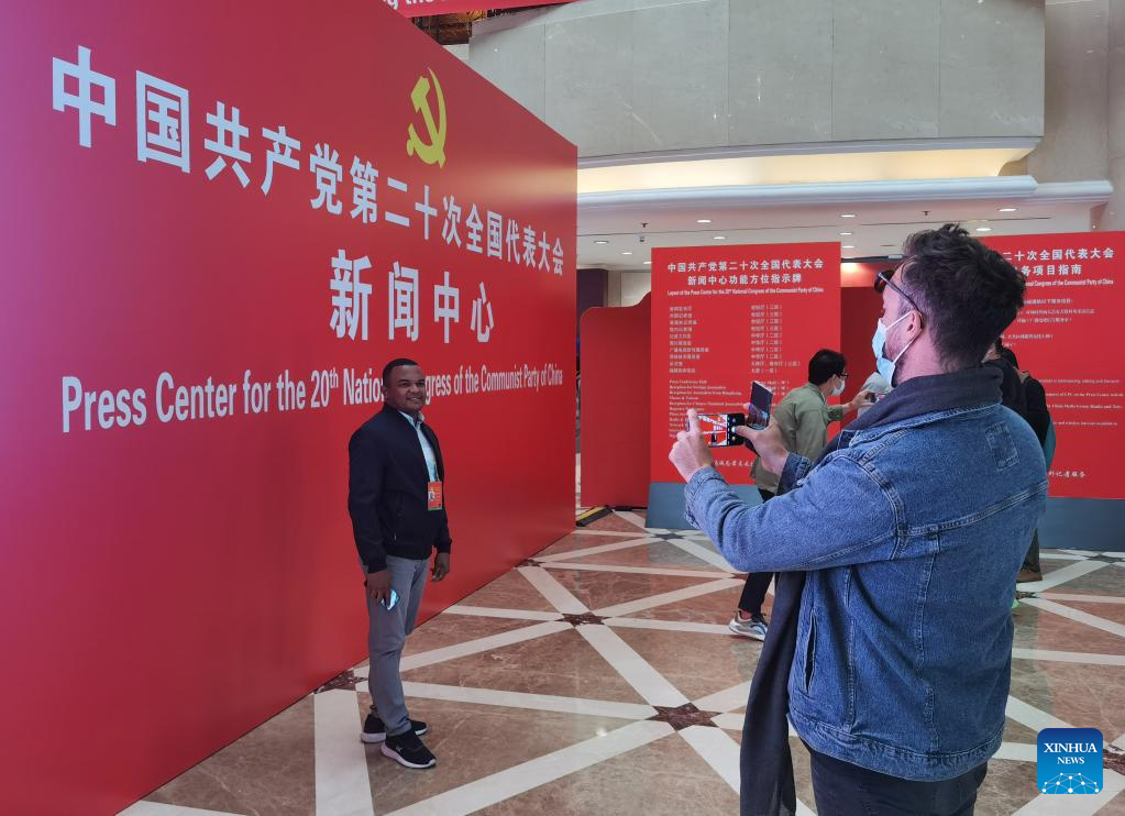 A journalist poses for a photo at the press center for the 20th National Congress of the Communist Party of China (CPC) in Beijing, capital of China, on Oct. 12, 2022. The press center for the upcoming 20th National Congress of the Communist Party of China (CPC) officially opened on Wednesday to provide services for journalists covering the congress. (Xinhua/Yin Gang)