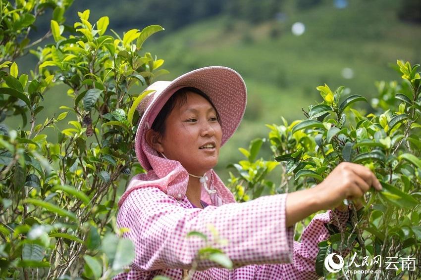 A villager picks tea leaves in Bingdao village, Mengku township, Shuangjiang Lahu, Wa, Bulang and Dai Autonomous County, southwest China's Yunnan Province. (People's Daily Online/Hu Zunhui)