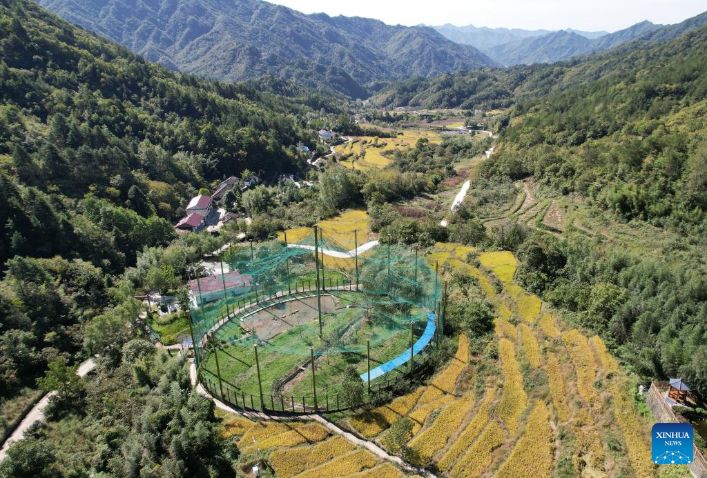Aerial photo taken on Oct. 10, 2022 shows organic paddy rice fields near a crested ibis feralization base in Ningshan County of northwest China's Shaanxi Province. In recent years, Ningshan County has made great efforts in ecological protection and green development, with local forest coverage rate reaching 96.24 percent and the population of crested ibises, giant pandas and golden snub-nosed monkeys growing. (Xinhua/Shao Rui)