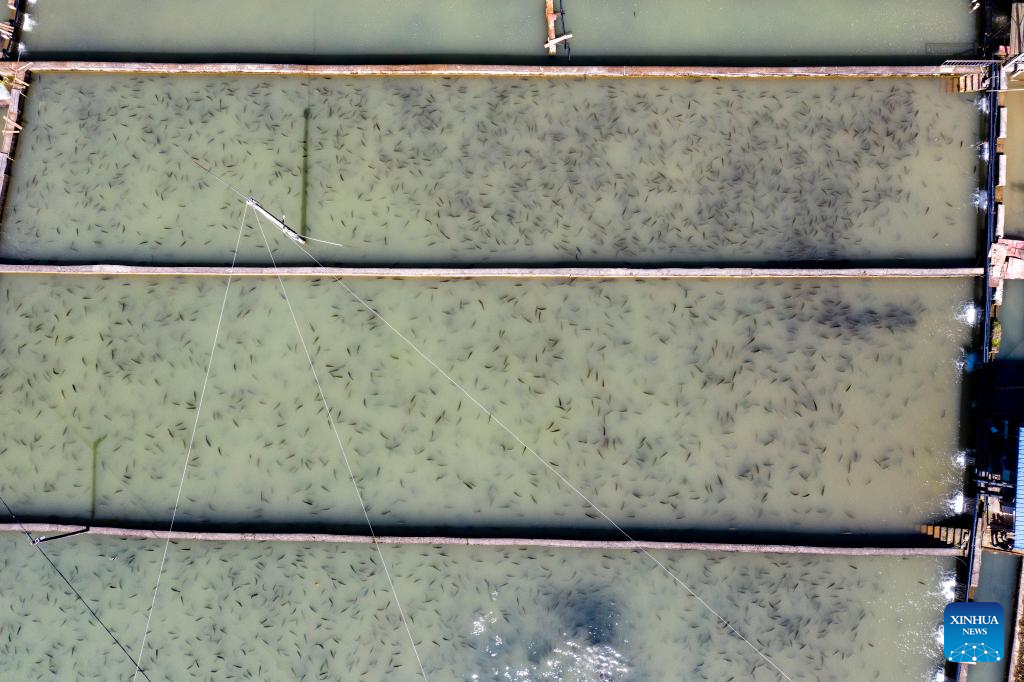 Aerial photo taken on Oct. 11, 2022 shows a cold-water fish farming base in Ming'an Village, Liaozi Township, Chengkou County, southwest China's Chongqing. Taking advantage of the ecological resources, cold-water fish farming in Liaozi Township has become a distinctive local industry and increased the villagers' income. (Xinhua/Huang Wei)