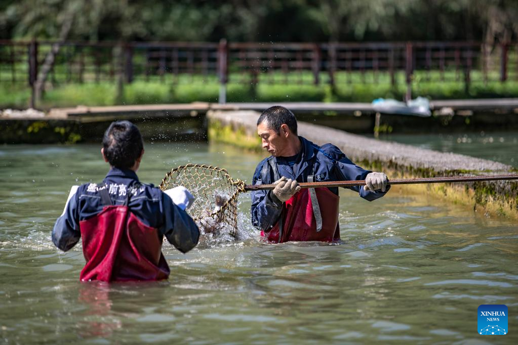 Staff members catch rainbow trout at a cold-water fish farming base in Ming'an Village, Liaozi Township, Chengkou County, southwest China's Chongqing, Oct. 11, 2022. Taking advantage of the ecological resources, cold-water fish farming in Liaozi Township has become a distinctive local industry and increased the villagers' income. (Xinhua/Huang Wei)