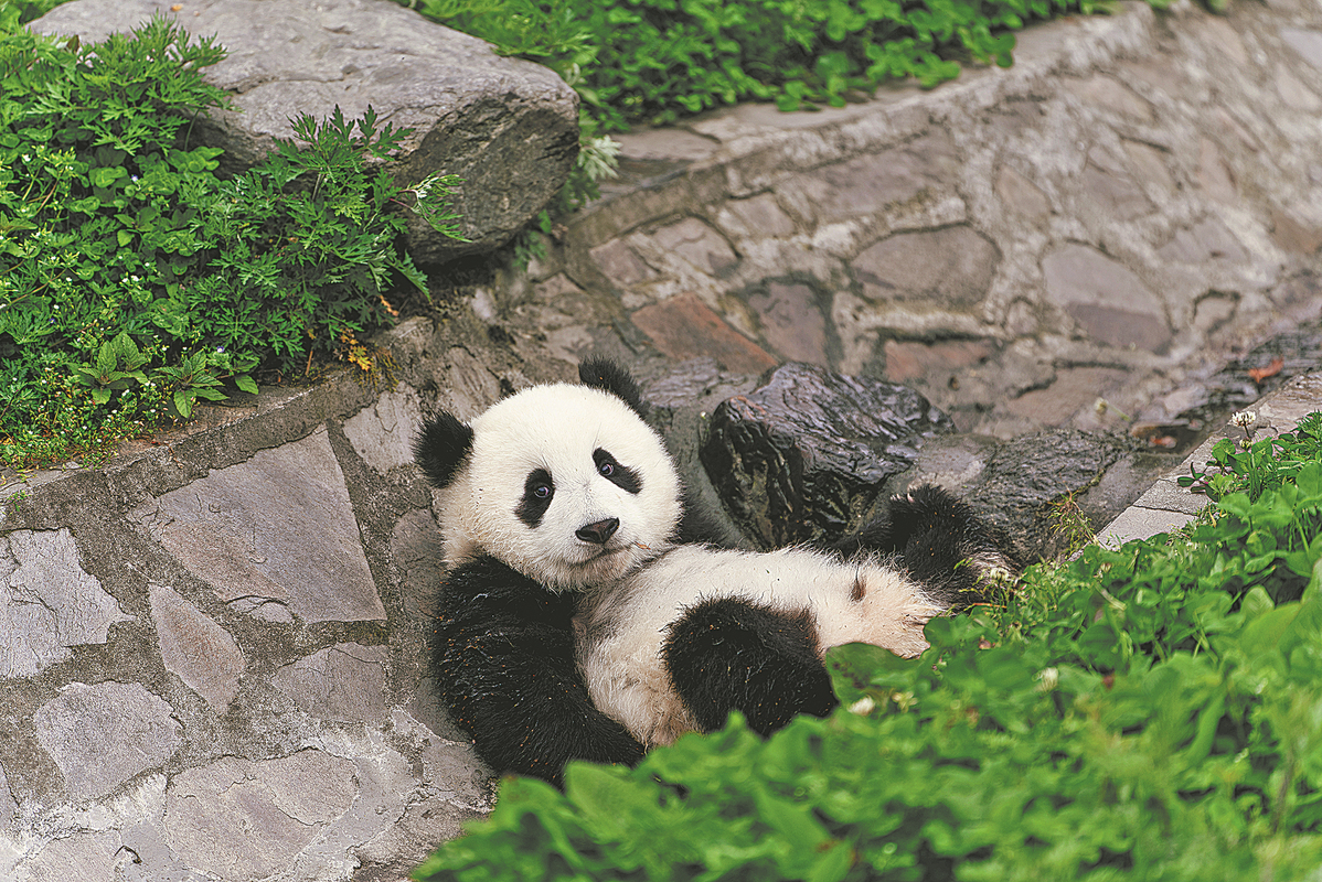 A giant panda cub rests at Wolong National Nature Reserve, Sichuan province. [Photo/Xinhua]