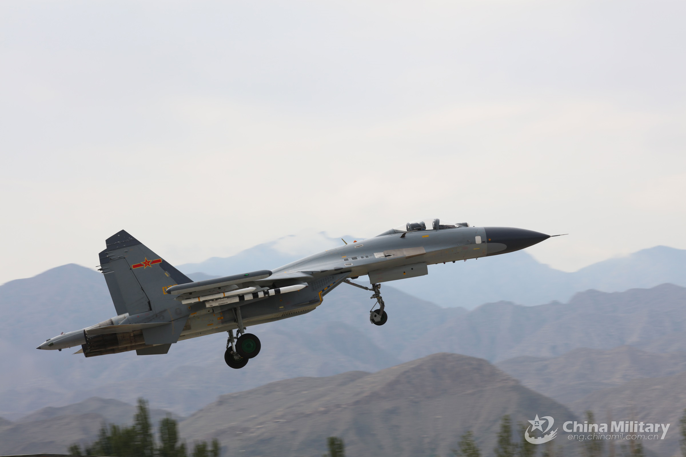 A fighter jet attached to an aviation brigade of air force under the PLA Western Theater Command takes off for a flight training exercise on September 18, 2022. (eng.chinamil.com.cn/Photo by Yu Zeqi)