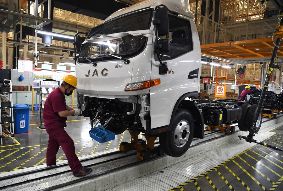 An employee works on a truck assembly line at a production base of Anhui Jianghuai Automobile Group Corp., Ltd. in Hefei, east China's Anhui Province, April 21, 2022. (Xinhua/Bai Bin)