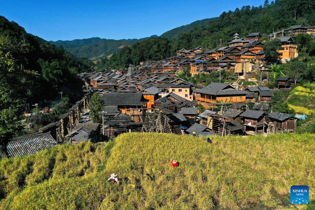 Aerial photo taken on Oct. 12, 2022 shows people harvesting paddy rice at Zhanli Village of Congjiang County, southwest China's Guizhou Province. (Xinhua/Yang Wenbin)