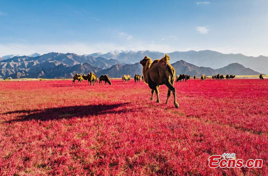 Camels forage at Dulan Lake National Wetland Park in Qaidam Basin, northwest China's Qinghai Province. A large field of forage grass grows on the wetland in the park, turning it scarlet. (Photo: China News Service/Ma Xiang)