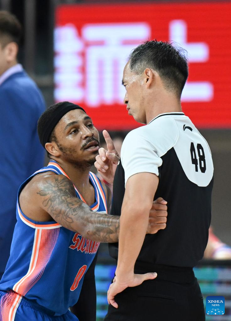 Marlain Veal (L) of Sichuan Blue Whales communicates with the referee during the 2nd round match between Guangzhou Loong Lions and Sichuan Blue Whales at the 2022-2023 season of the Chinese Basketball Association (CBA) league in Hangzhou, east China's Zhejiang Province, Oct. 14, 2022. (Xinhua/Chen Zhenhai)