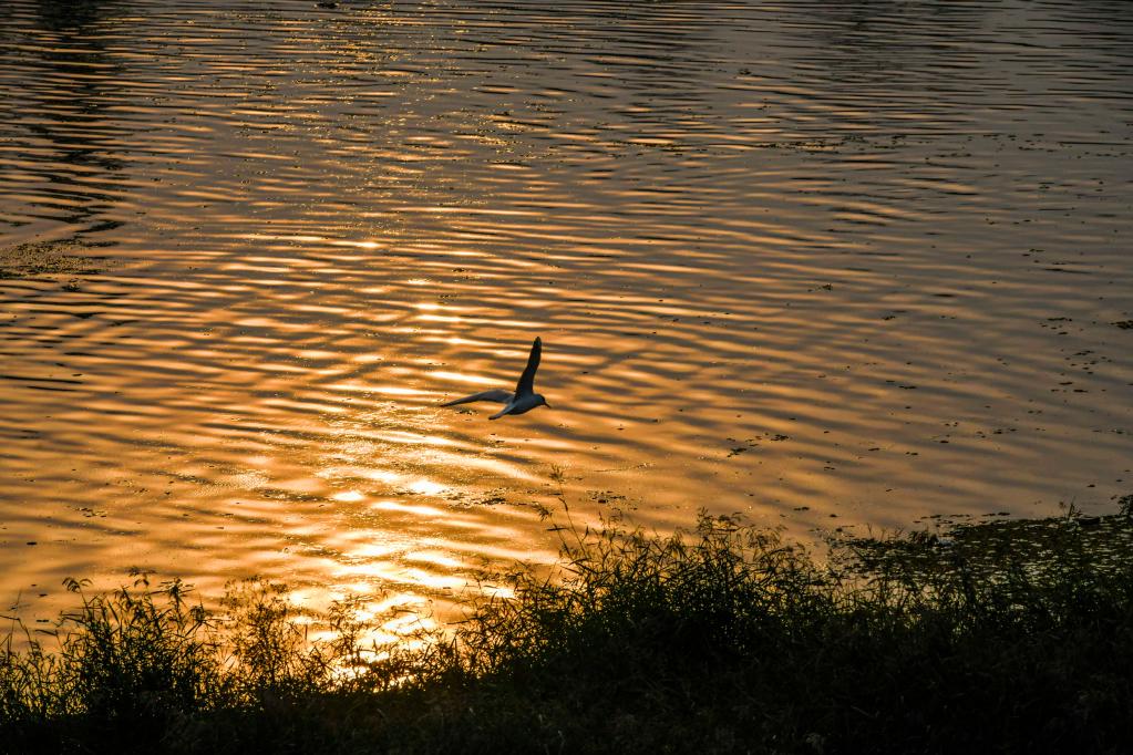 Photo taken on Oct. 12, 2022 shows a waterfowl flying over the surface of the Shahe River in Zunhua City, north China's Hebei Province. (Photo by Liu Mancang/Xinhua)