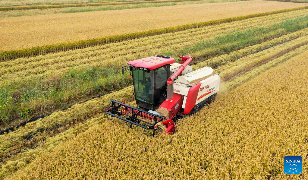 Aerial photo taken on Oct. 13, 2022 shows a harvester working at a paddy field in Xiaozhan Town of Jinnan District in north China's Tianjin. Xiaozhan rice, which is a popular rice variety in China, is originated in Xiaozhan Town of Tianjin. Lately Xiaozhan rice has entered its harvest season. (Xinhua/Sun Fanyue)