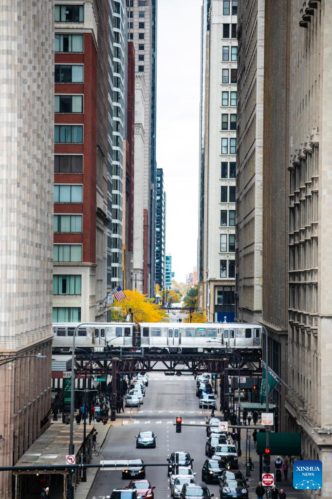 A train passes over Monroe Street in downtown Chicago, the United States, Oct. 16, 2022. (Photo by Vincent D. Johnson/Xinhua)