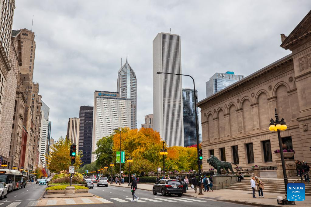 Photo taken on Oct. 16, 2022 shows the fall scenery of Michigan Avenue by the Art Institute in downtown Chicago, the United States. (Photo by Vincent D. Johnson/Xinhua)