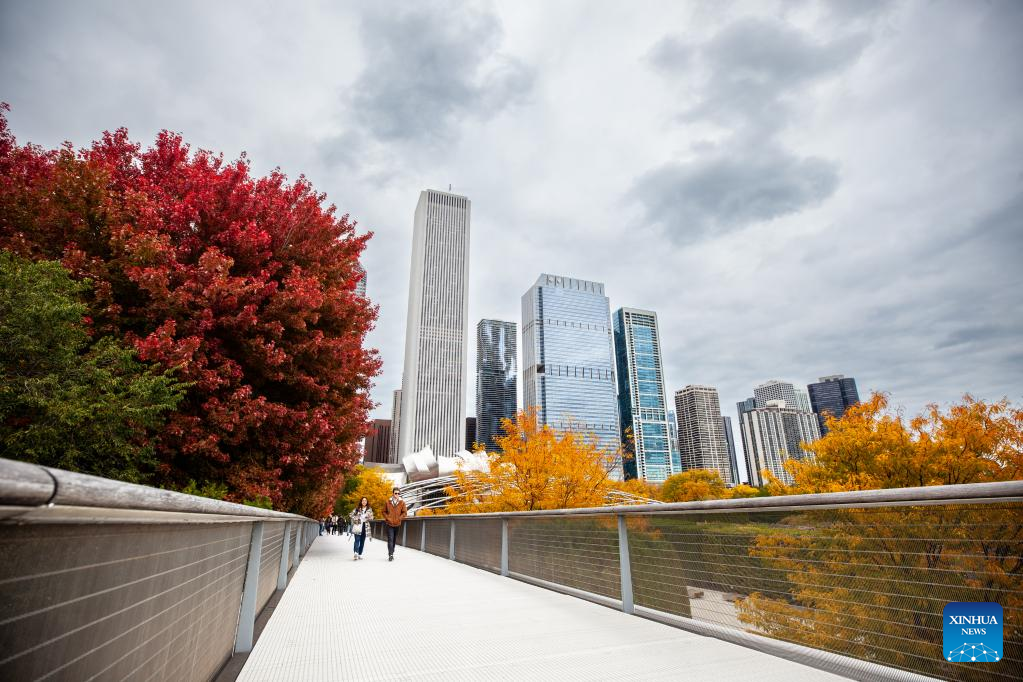 People walk along the Nichols Bridge at Millennium Park in downtown Chicago, the United States, Oct. 16, 2022. (Photo by Vincent D. Johnson/Xinhua)