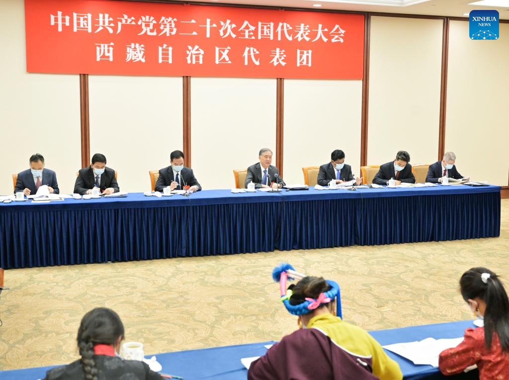 Wang Yang joins a group discussion with delegates from southwest China's Tibet Autonomous Region who are attending the 20th National Congress of the Communist Party of China (CPC) in Beijing, Oct. 17, 2022. (Xinhua/Gao Jie)
