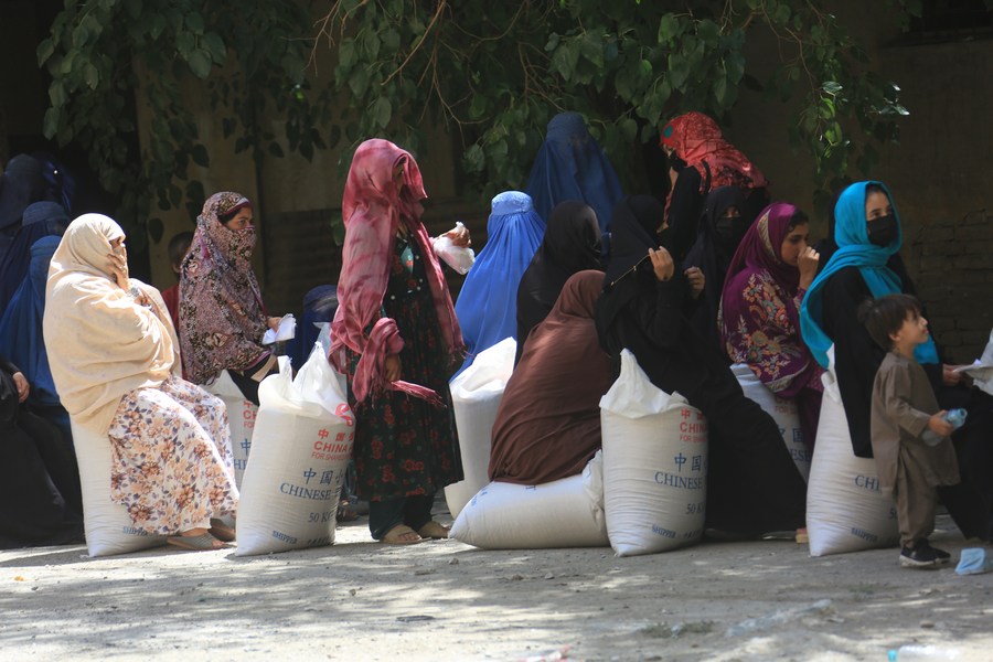 Afghan people receive China-donated food aid in Kabul, Afghanistan, Aug. 17, 2022. (Photo by Saifurahman Safi/Xinhua)