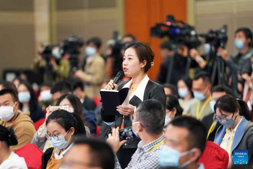 A journalist asks questions via video link during the second group interview hosted by the press center for the 20th National Congress of the Communist Party of China (CPC) in Beijing, Oct. 18, 2022. The spokespersons for delegations from Heilongjiang, Shanghai, Jiangsu, Zhejiang, Anhui, Fujian and Jiangxi to the 20th CPC National Congress introduced the delegations' study and discussion on the report to the 20th CPC National Congress, and answered questions from journalists during the interview. (Xinhua/Chen Yehua)