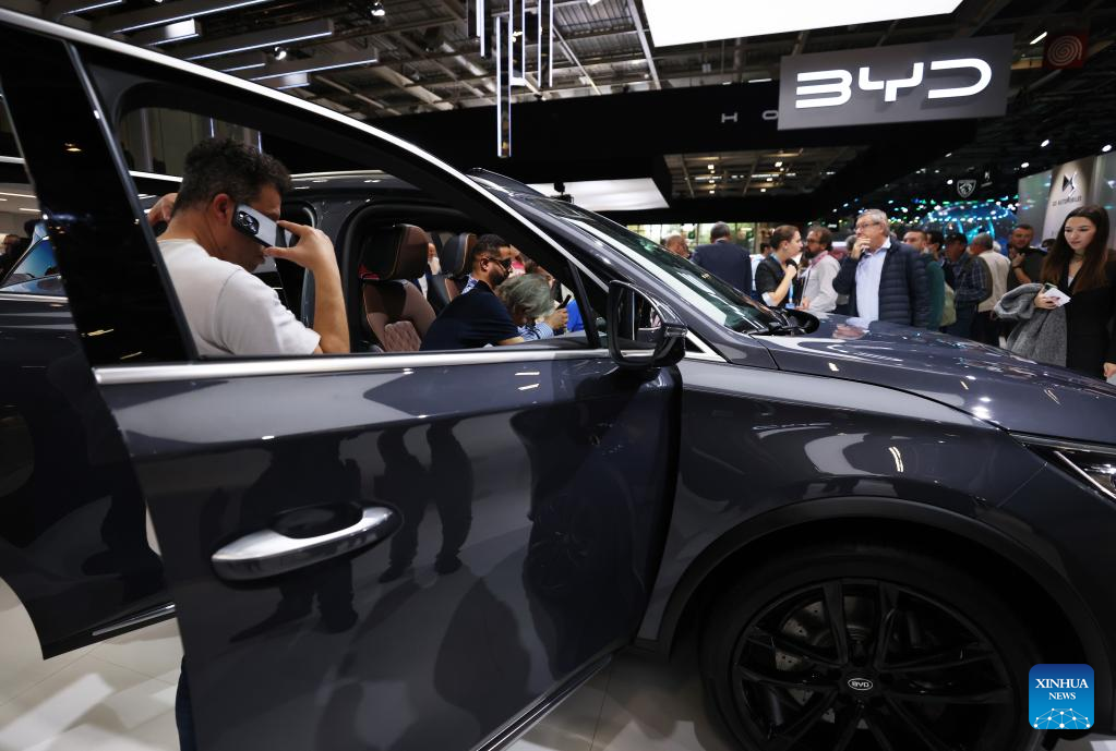 People visit the BYD stand during the Paris Motor Show in Paris, France, Oct. 18, 2022. The 89th Paris Motor Show is held here from Oct. 17 to 23. (Xinhua/Gao Jing)