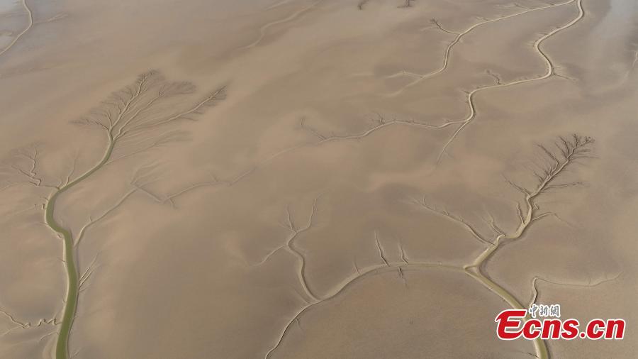 The tidal-flat presents a tree-shaped landscape at the Yellow River estuary where the Yellow River, China's second-longest river, joins the Bohai Sea in Dongying, east China's Shandong Province, Oct. 17, 2022. (Photo: China News Service/Yang Bin)