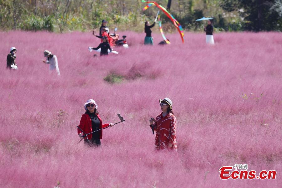 Visitors pose for photos at a field of pink muhly grass at Sanqiao wetland park in Nanjing, east China's Jiangsu Province, Oct. 18, 2022. (Photo: China News Service/Yang Bo)