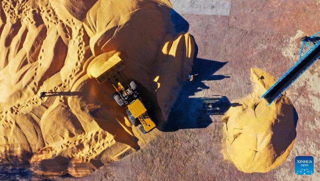 This aerial photo shows farmers drying corn in Naiman Banner of Tongliao City, north China's Inner Mongolia Autonomous Region, Oct. 18, 2022. (Xinhua/Lian Zhen)