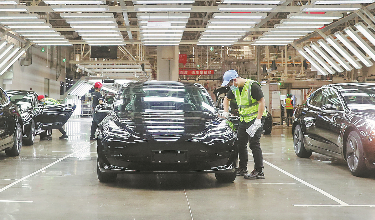 Employees at work at the Shanghai plant of Tesla Inc. [Photo/Xinhua]
