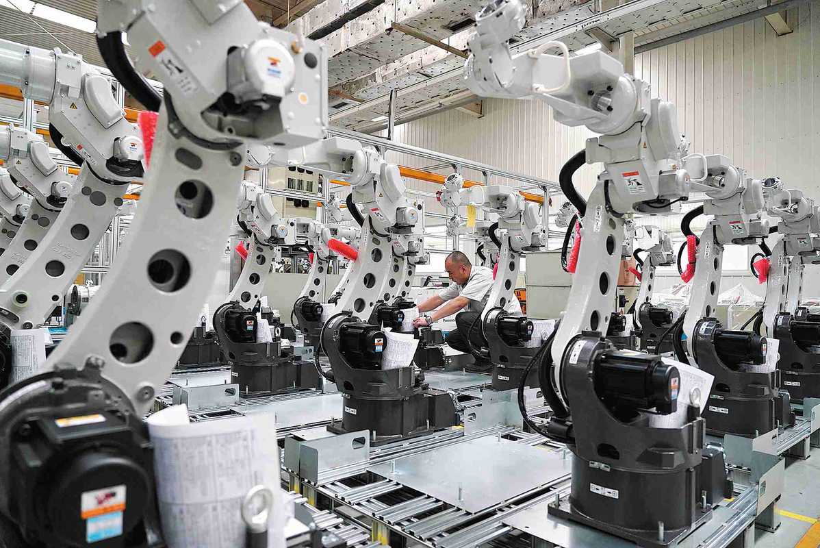 An employee checks welding robots at a manufacturer in Tangshan, Hebei province. [Photo/Xinhua]