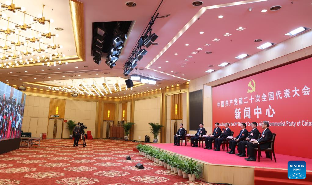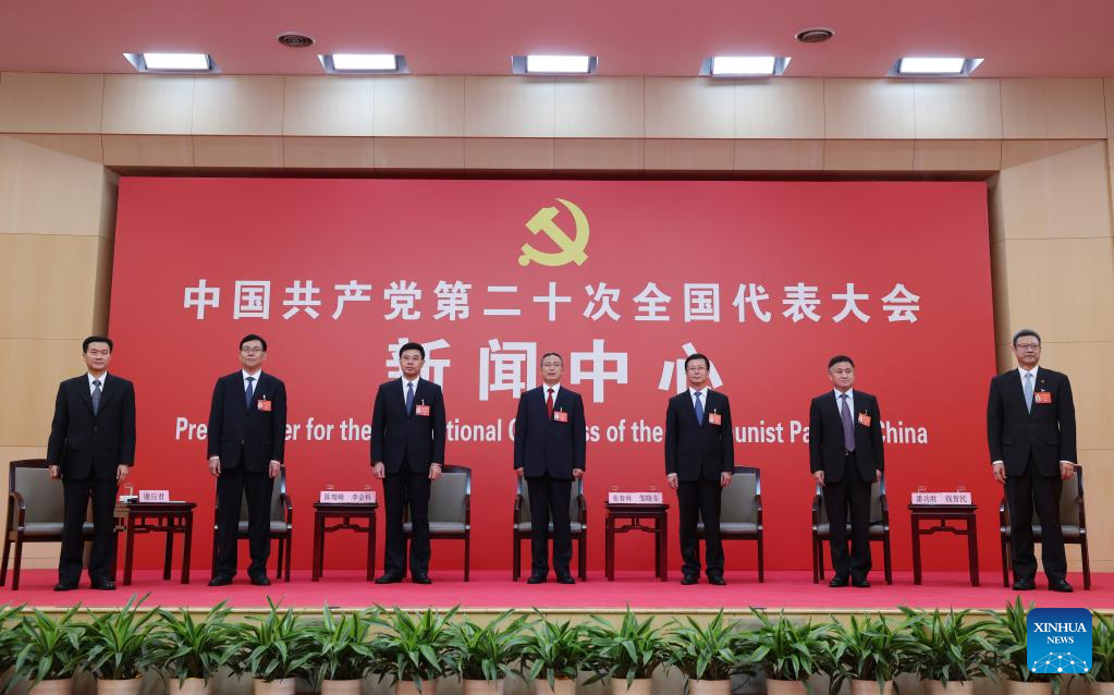 The spokespersons for the delegations from Qinghai, Ningxia, Xinjiang, the central Party and state organs, central financial institutions and central enterprises (in Beijing) to the 20th National Congress of the Communist Party of China (CPC) meet the press during a group interview in Beijing, capital of China, Oct. 20, 2022. The press center for the 20th CPC National Congress hosted its fifth group interview on Thursday. During the interview, the spokespersons introduced the delegations' study and discussion on the report to the 20th CPC National Congress, and answered questions from journalists. (Xinhua/Zhang Yuwei)