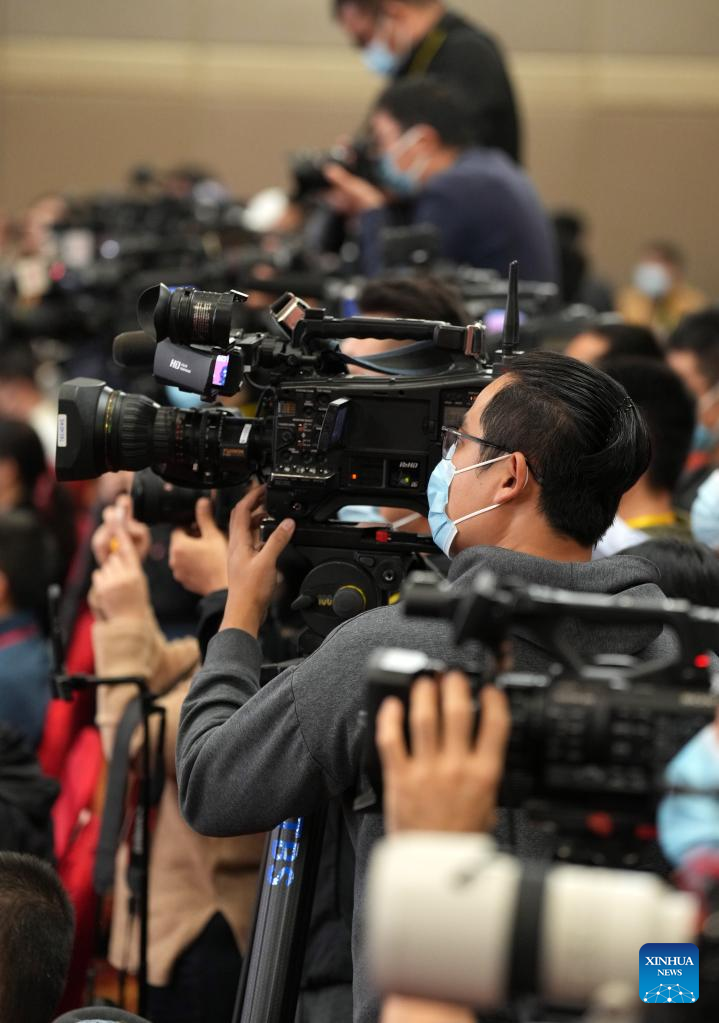 Journalists attend the fifth group interview hosted by the press center for the 20th National Congress of the Communist Party of China (CPC) in Beijing, capital of China, Oct. 20, 2022. During the interview, the spokespersons for the delegations from Qinghai, Ningxia, Xinjiang, the central Party and state organs, central financial institutions and central enterprises (in Beijing) to the 20th CPC National Congress introduced the delegations' study and discussion on the report to the 20th CPC National Congress, and answered questions from journalists. (Xinhua/Li Ming)