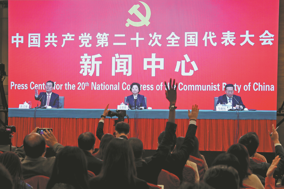 Journalists raise their hands to ask questions via video link at a news conference in Beijing on Thursday on China's diplomacy held on the sidelines of the 20th National Congress of the Communist Party of China. [Photo by WANG ZHUANGFEI/CHINA DAILY]