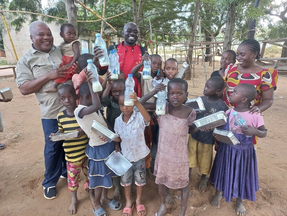 Villagers and children of Mtegowasimba village, Morogoro region, Tanzania show soybean milk they have made. (Photo courtesy of the College of International Development and Global Agriculture, China Agricultural University)