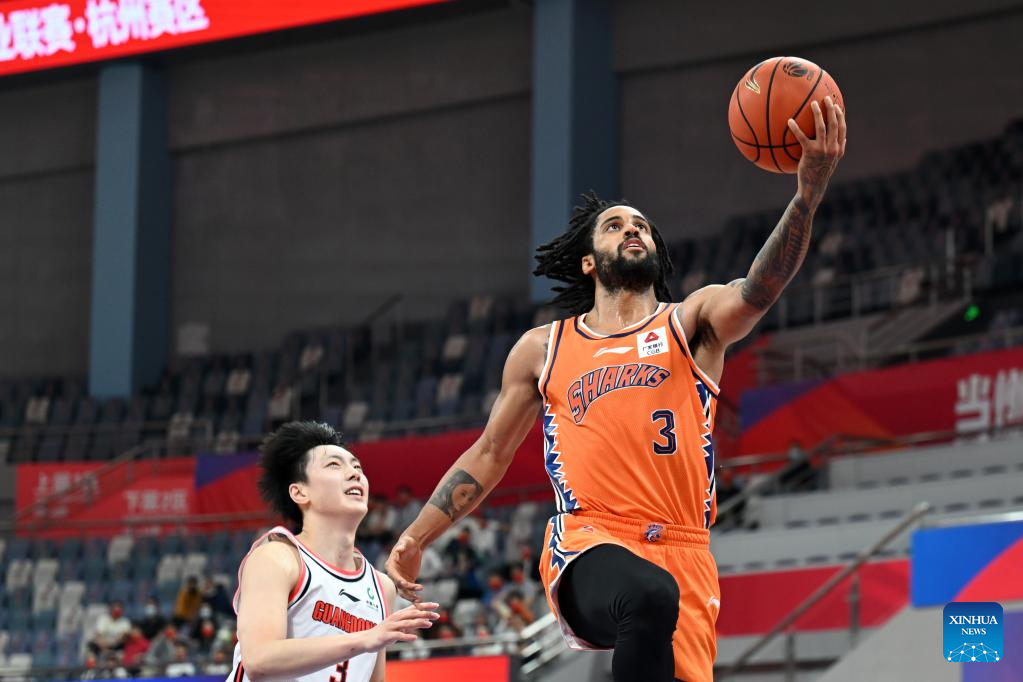 Melo Trimble (R) of Shanghai Sharks goes for a lay-up during the 4th round match against Guangdong Southern Tigers at the 2022-2023 season of the Chinese Basketball Association (CBA) league in Hangzhou, east China's Zhejiang Province, Oct. 21, 2022. (Xinhua/Chen Zhenhai)